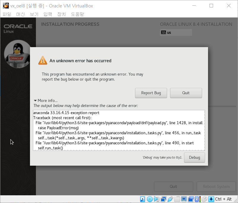 에러 : Oracle Linux 8 설치 중 An unknown error has occurred