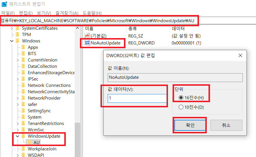 컴퓨터\HKEY_LOCAL_MACHINE\SOFTWARE\Policies\Microsoft\Windows\WindowsUpdate\AU 이동 후 (없다면 생성) NoAutoUpdate 생성 및 값 1로 변경(16진수)