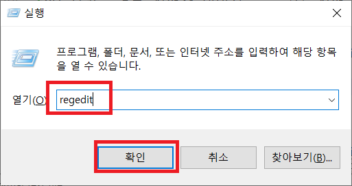 윈도우키 + R로 실행창 열어서 regedit 실행