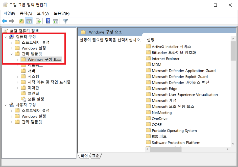 컴퓨터 구성 - 관리 템플릿 - Windows 구성 요소 - Windows 업데이트 탭으로 들어가기
