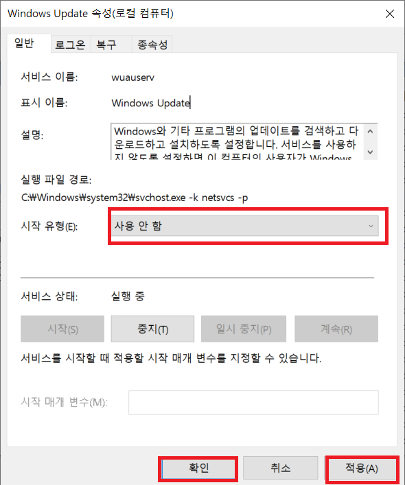 서비스 정지 요약 : 윈도우키 + R로 실행창 열기 - service.msc - Windows Update 우클릭 - 속성 - 중지 및 사용안함 설정