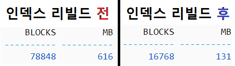 리빌드 후 인덱스 블록 및 용량이 줄어듬