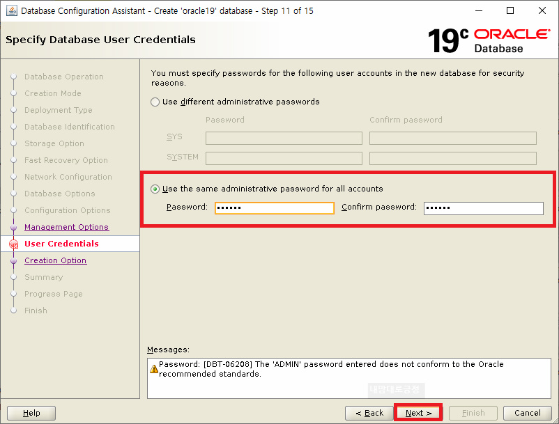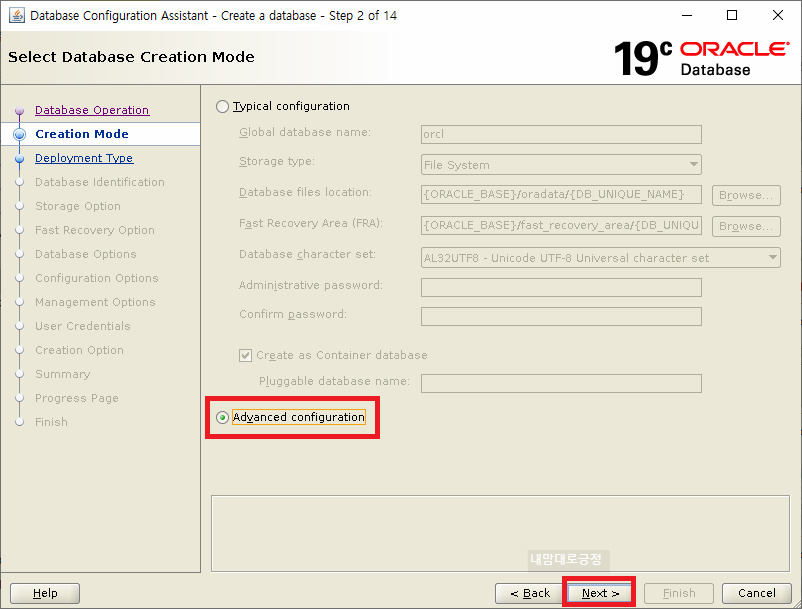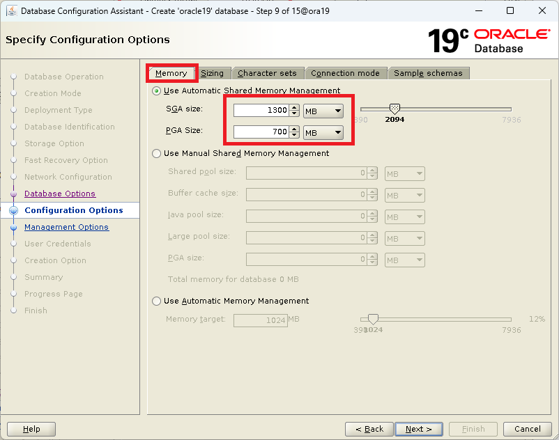 Memory 에서 ASMM 선택, SGA 사이즈는 1300MB, PGA는 700MB 선택