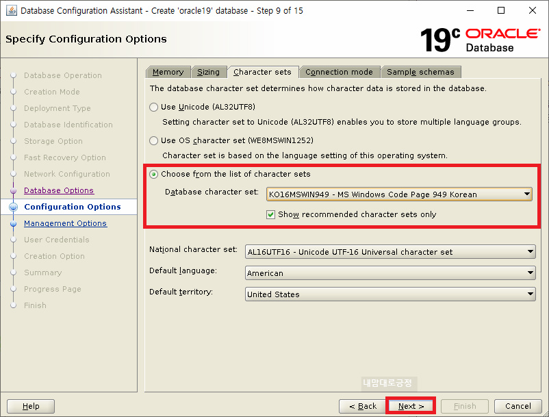 Choose from the list of character sets 는 KO16MSWIN949 선택
