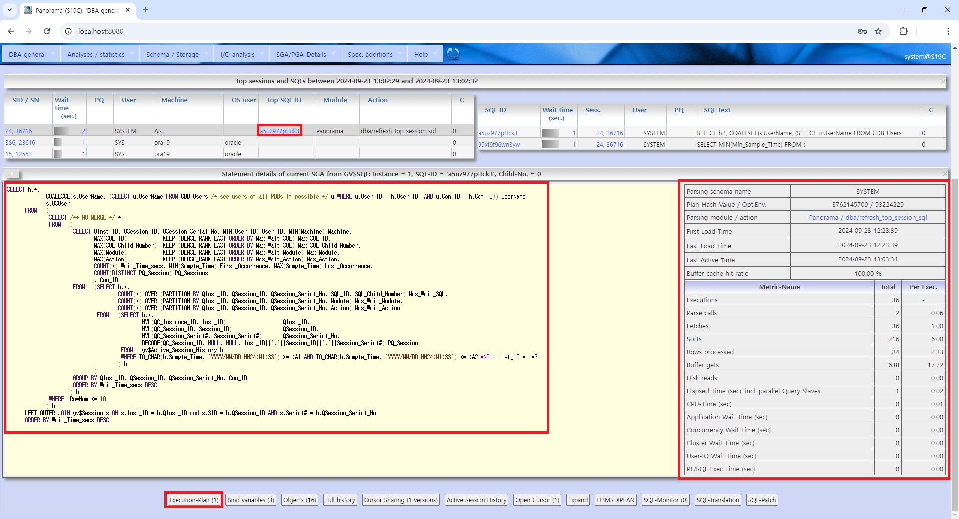 - Panorama의 "SQL 모니터" 기능은 연결된 Oracle 데이터베이스에 "Tuning Pack" 라이선스가 있을 때만 사용 가능