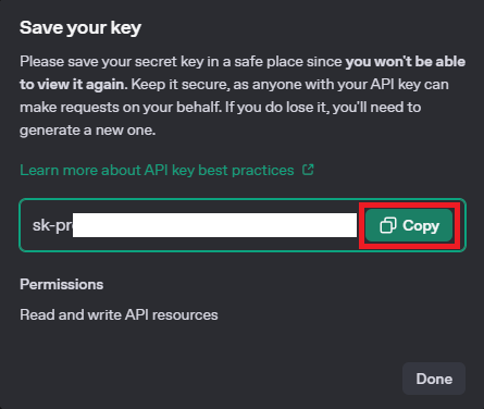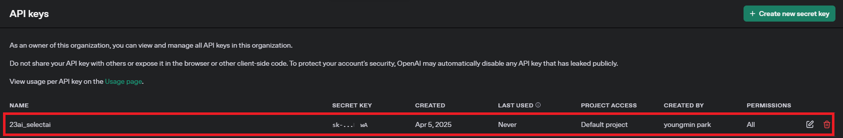 발급 받은 키 저장(이 창을 닫으면 더이상 키를 볼수없으니 개인 공간에 저장해둬야함)