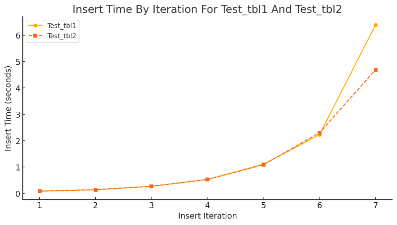 | insert 회차 | insert 한 row 수 | insert 소요 시간(test_tbl1) | insert 소요 시간(test_tbl2) |