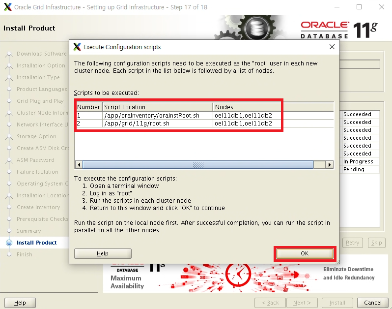 (2번노드 root.sh는 문제가 있어 deconfig 등 여러 절차를 거치면서 실행해서 로그가 온전하지는 못함)