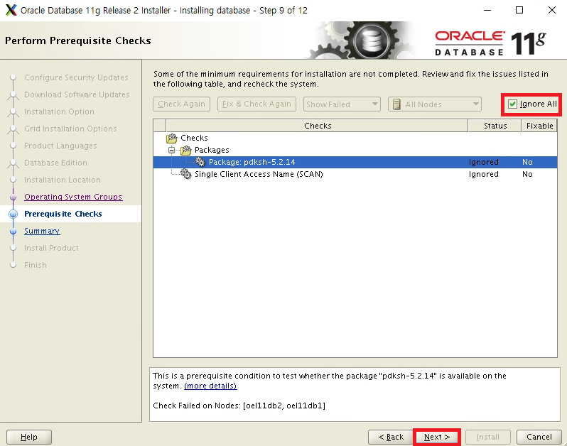 SCAN 관련메세지는 SCAN IP가 DNS에 등록되어 있지 않아서 발생한 문제 모두 Ignore