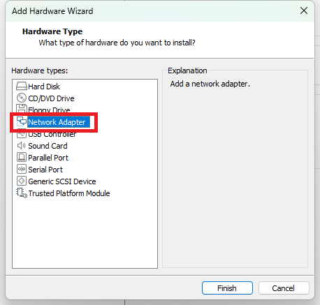 네트워크 어댑터 추가를 위해 Add - Network Adapter 선택Network Adapter 선택