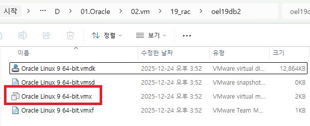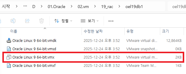 vmware 프로그램 종료 후 19_rac\oel19db1\Oracle Linux 9 64-bit.vmx 메모장으로 열기
