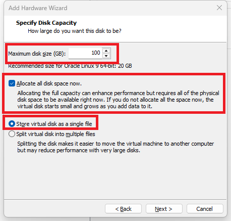 100GB 입력 후 Store virtual disk as a single file 선택