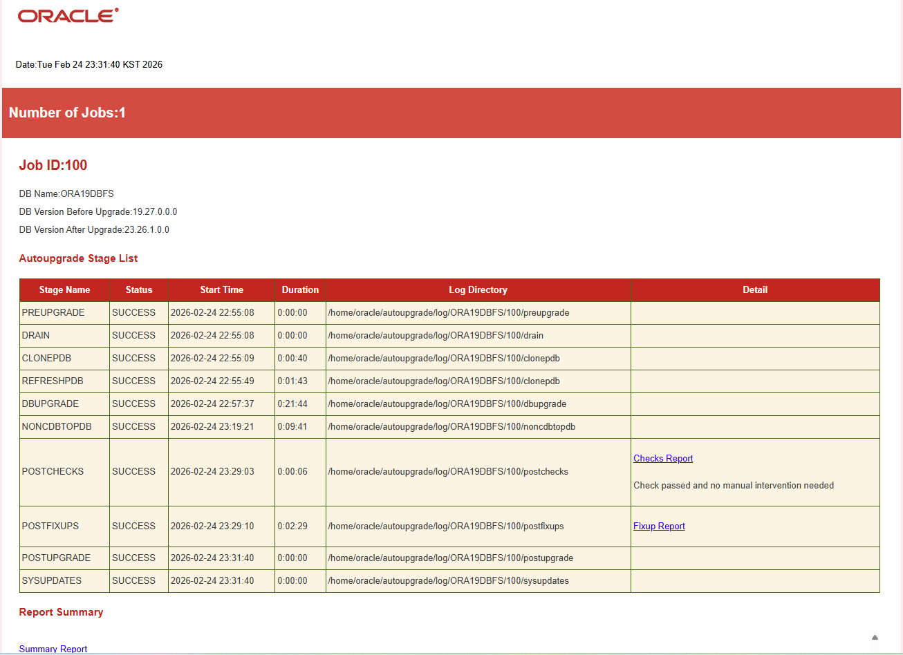 $ cat /home/oracle/autoupgrade/log/ORA19DBFS/100/dbupgrade/upg_summary.log