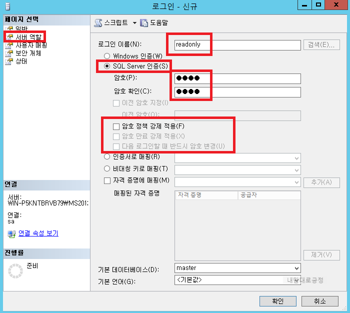 로그인 이름, 패스워드 입력, 암호 정책 강제적용 해제 후 서버 역할 선택