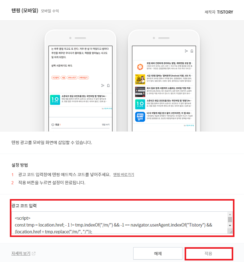 광고 코드 입력 란에 아래 스크립트 입력 후 적용