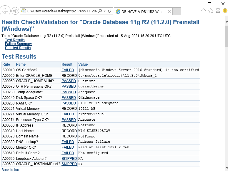 Test "Oracle Database 11g R2 (11.2.0) Preinstall (Windows)" executed at 16-Aug-2021 00:29:29