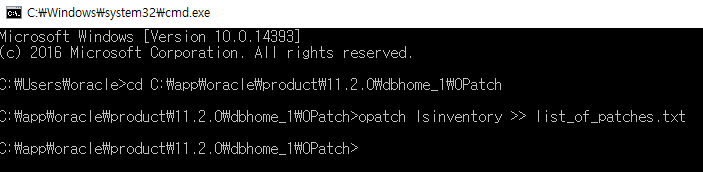 5_1. cmd 실행 후 $ORACLE_HOME/OPatch 경로로 이동 후 opatch lsinventory 실행 후 list_of_patches.txt 파일에 저장