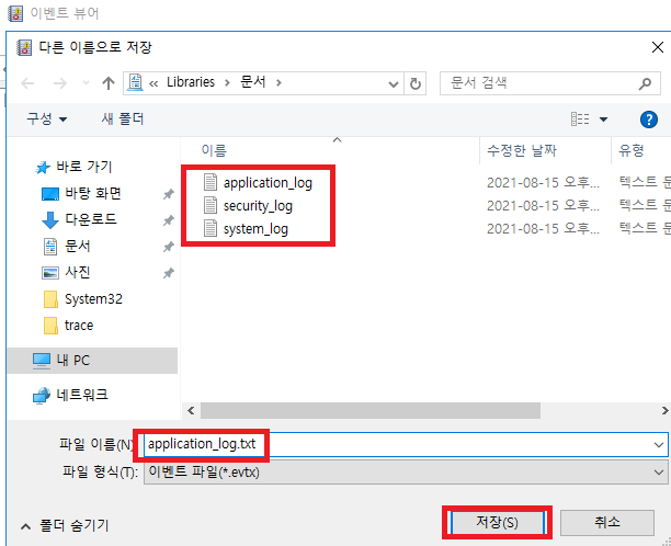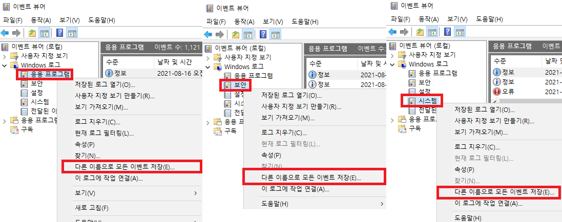 4_2. Windows 로그 - 응용프로그램, 보안, 시스템 로그 우클릭 후 다른 이름으로 모든 이벤트 저장 선택