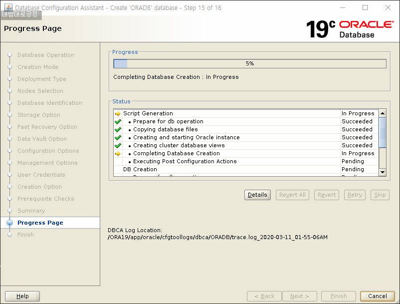 dbca install progress 가 나올때 갑자기 PRCS-1046(상세메세지는 없음) 발생 후 dbca가 종료됨