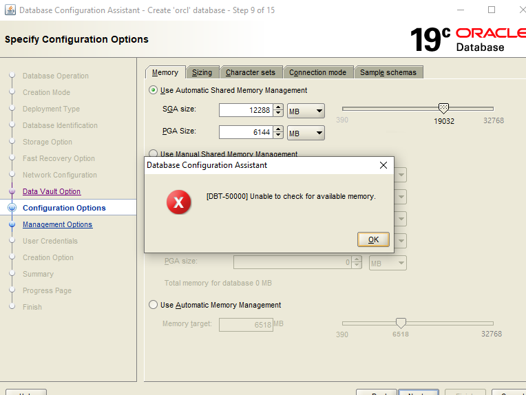 윈도우 서버 2019 환경에서 dbca 의 Configuration Options 에서 메모리량 설정 후 다음으로 넘길 때 발생하는 메세지