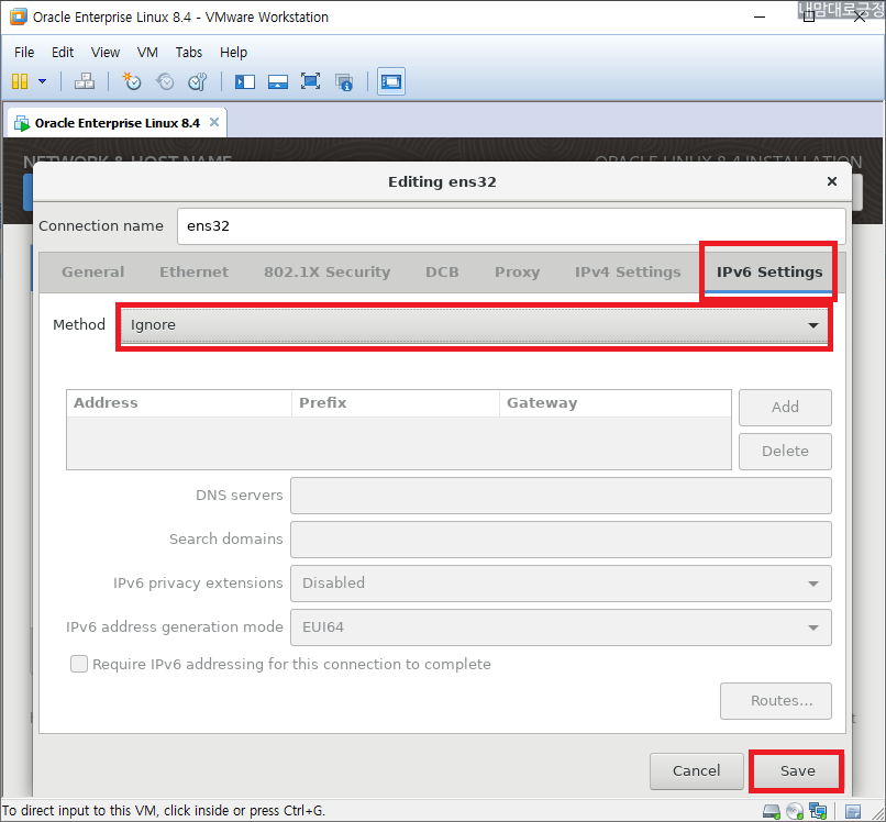 IPv6 설정, Ignore 선택 후 저장