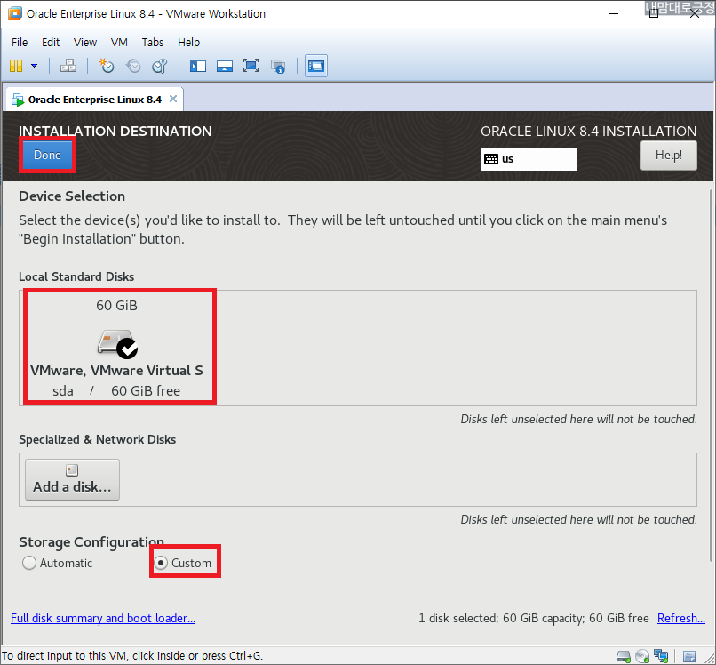 INSTALLATION DESTINATION, 디스크 선택 후 Custom 선택 후 Done