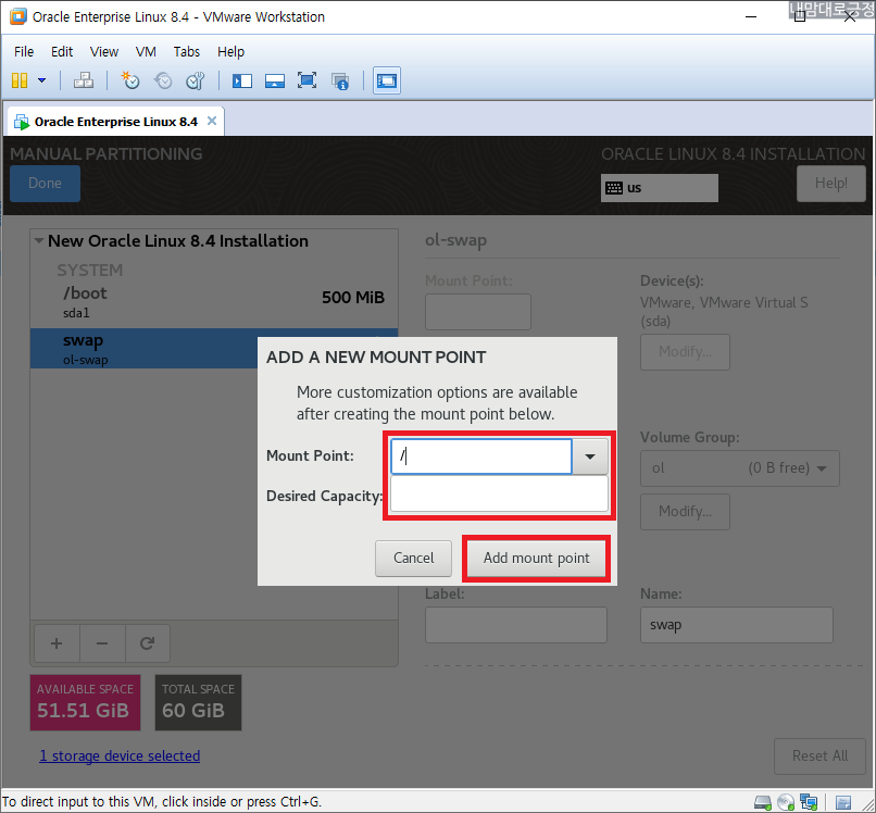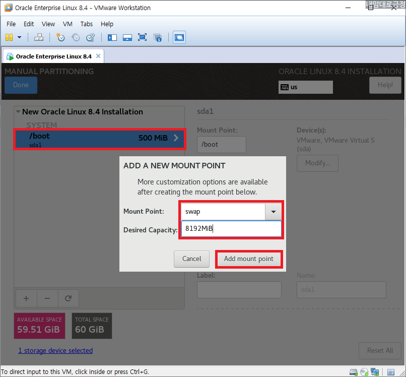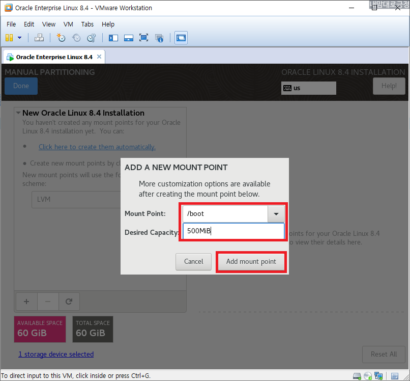 /boot 500MiB 마운트 지점 추가