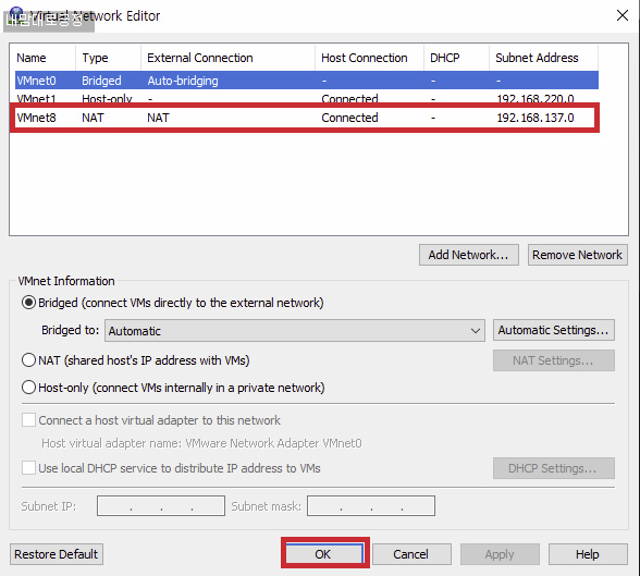 시작 전 네트워크 설정(Vmware - Edit - Virtual Network Editor)