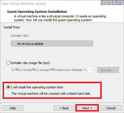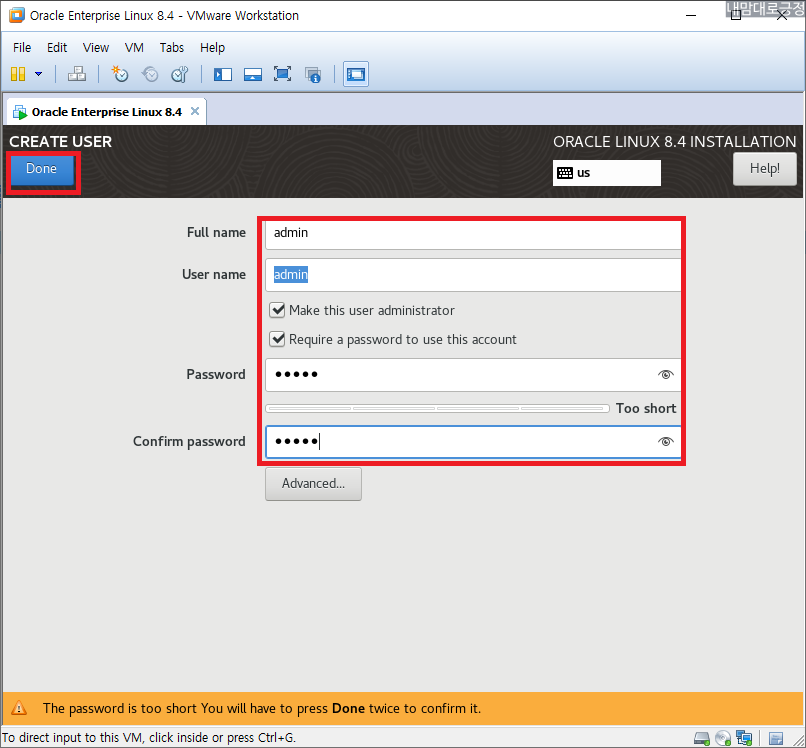 Oracle linux 8.4 설치 미디어 삽입 후 OK