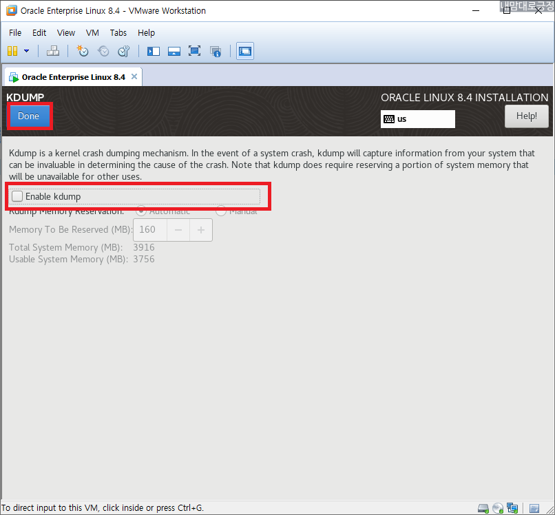 KDUMP, kdump 활성화 체크 해제 후 완료
