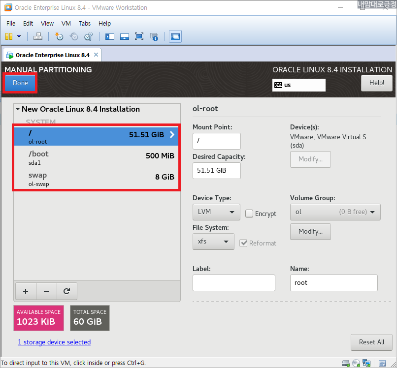 설정된 파티션 확인 후 Done