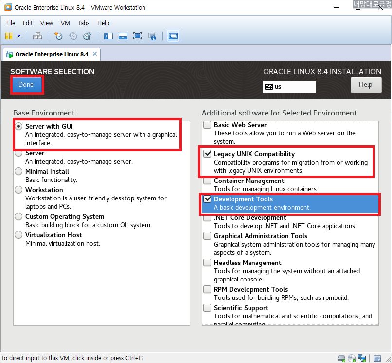 SOFTWARE SELECTION, Server with GUI 선택 - Legacy UNIX Compatibility, Development Tools 선택 후 Done