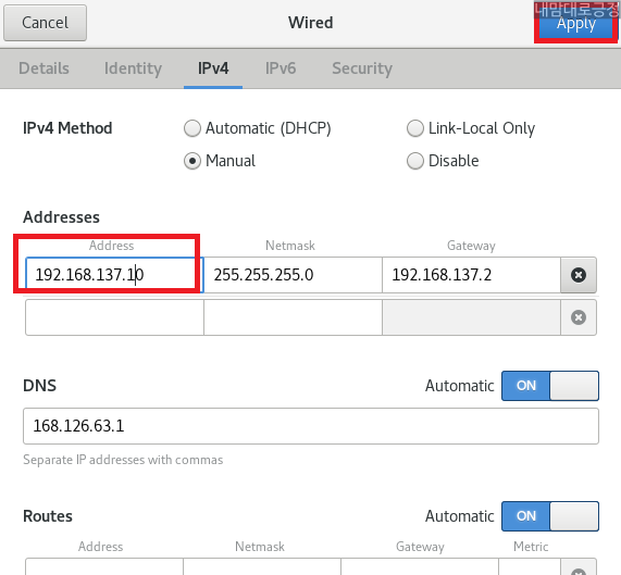 Address를 192.168.137.10으로 변경 후 Apply