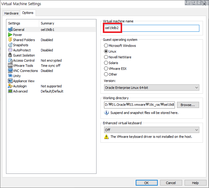 Options 에서 Virtual machine name을 oel19db1에서 oel19db2로 변경