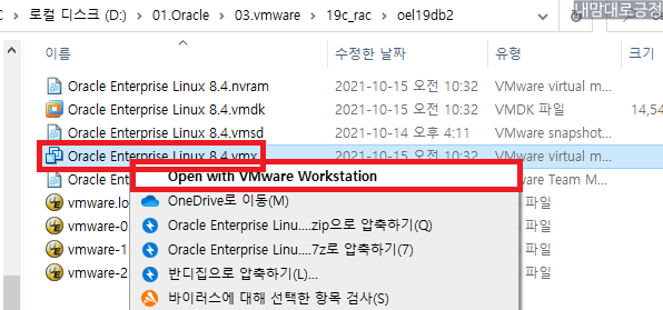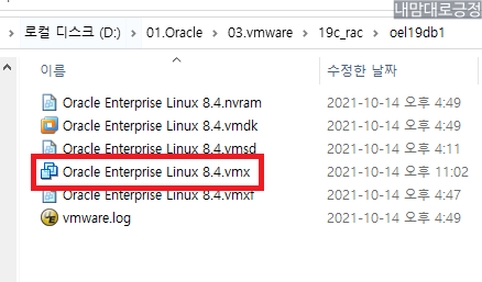 vmware 프로그램 종료 후 D:\01.Oracle\03.vmware\19c_rac\oel19db1\Oracle Enterprise Linux 8.4.vmx 메모장으로 열기