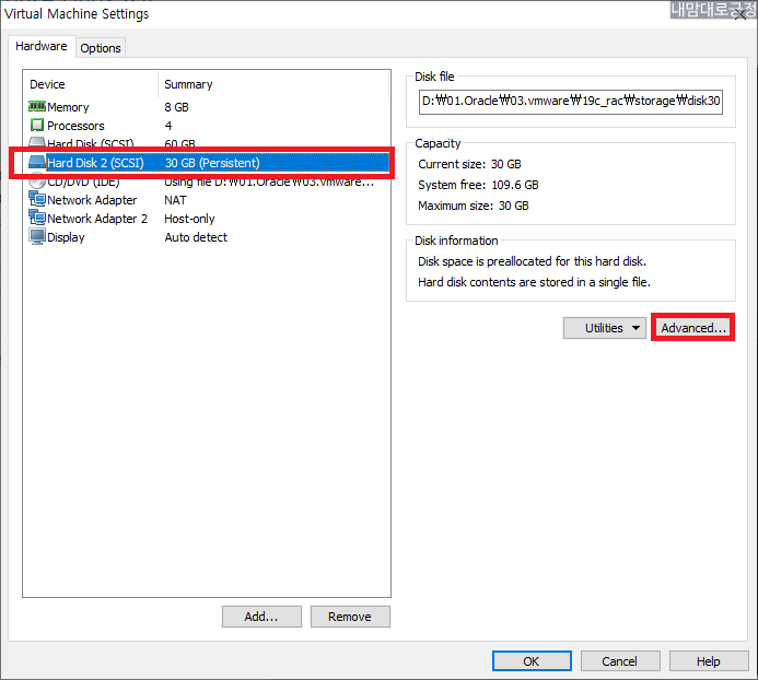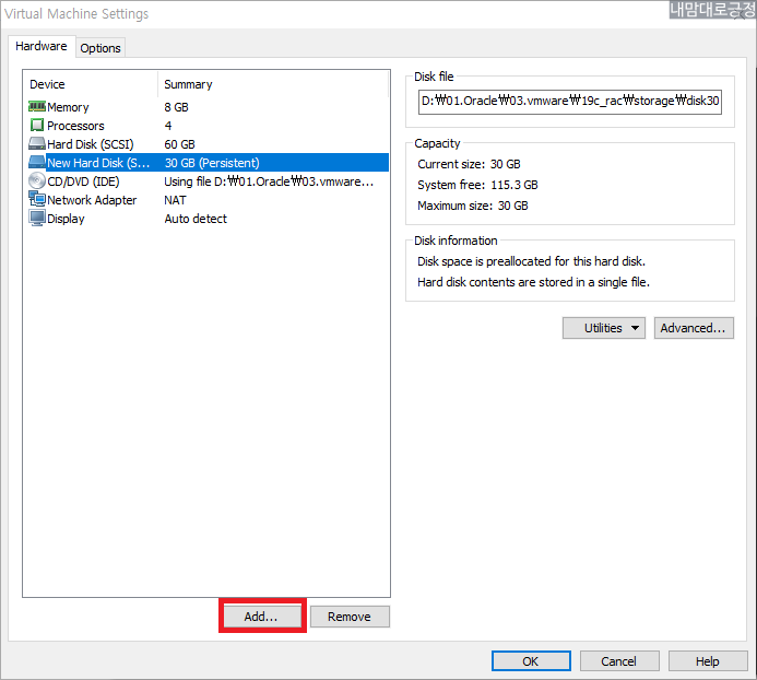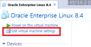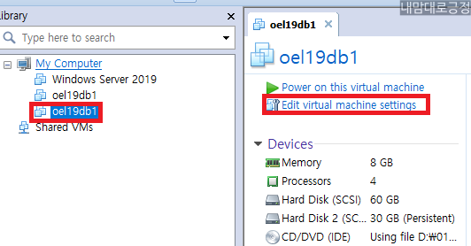 oel19db2의 vmx파일을 열어서 나온 vm에 Edit virtual machine settings 선택