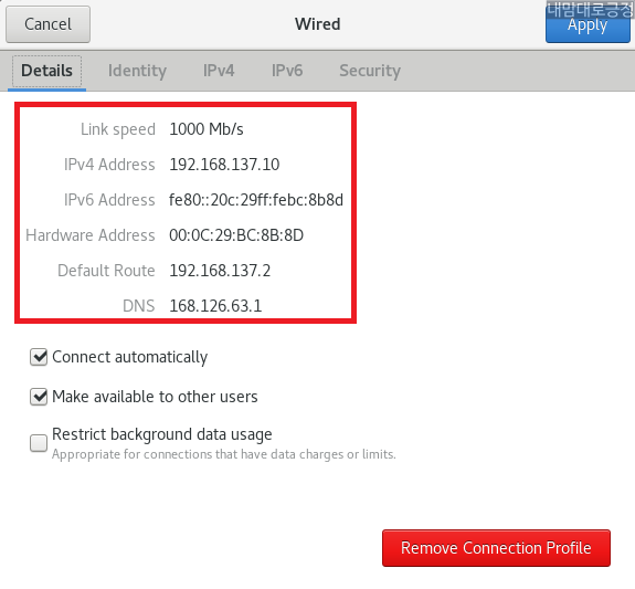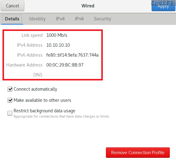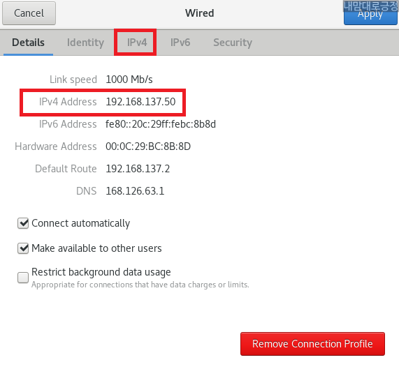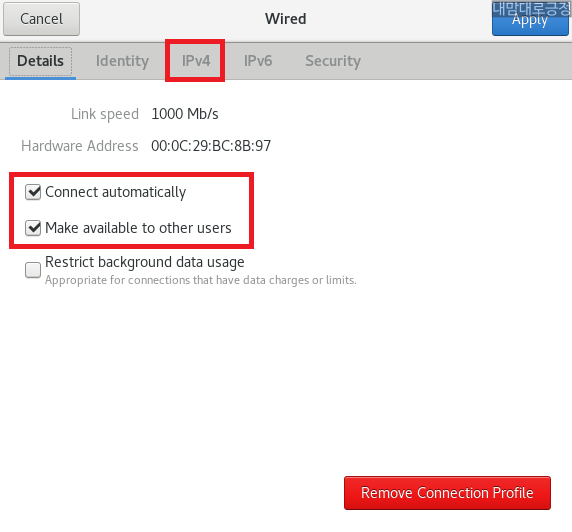 Connect automatically, Make available to other users 선택 후 IPv4 선택
