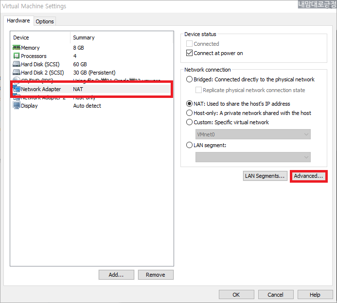 Network Adapter NAT 선택 후 Advanced 선택