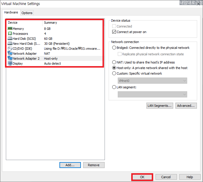 디스크와 네트워크 추가된 모습 확인 후 OK