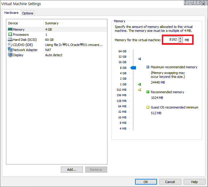 메모리 8gb로 수정(4gb도 가능)