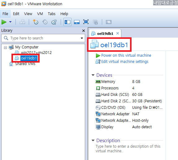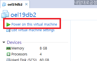oel19db2 폴더로 들어간 뒤 vmx 파일 실행