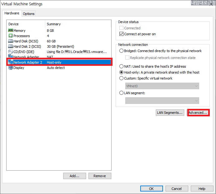 Network Adapter2 Host-only 선택 후 Advanced 선택