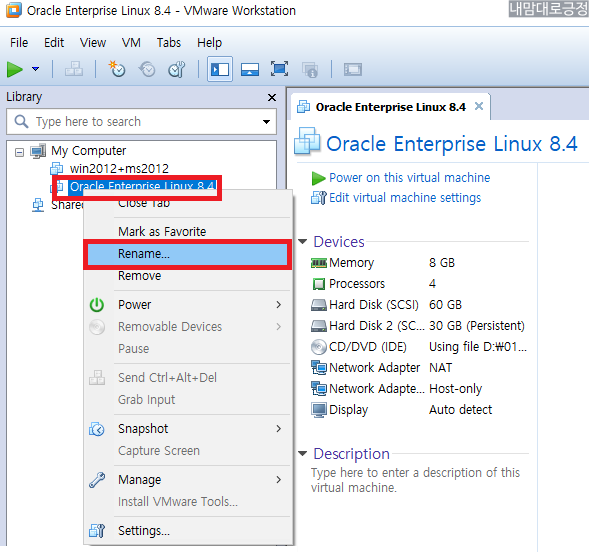 현재 vmware(Oracle Enterprise Linux 8.4)를 우클릭 - Rename