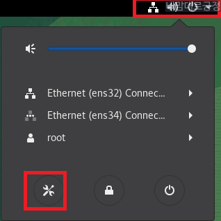 OS 기동 후 root 유저 접속 후 우측 상단 전원버튼 선택 후 설정 버튼 선택