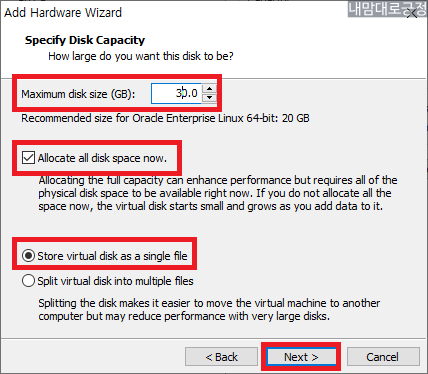 30GB 입력 후 Store virtual disk as a single file 선택