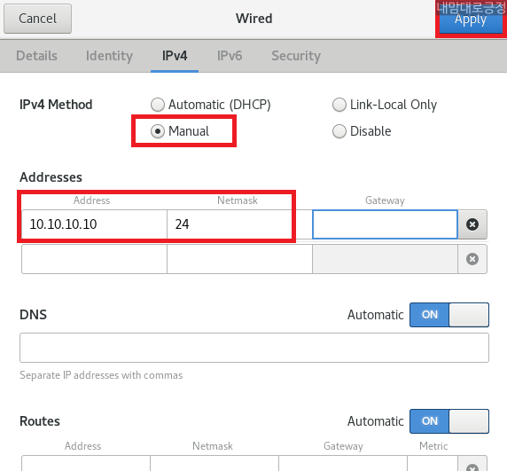 Manual 선택 후 Address/Netmask를 10.10.10.10/24 설정 후 Apply