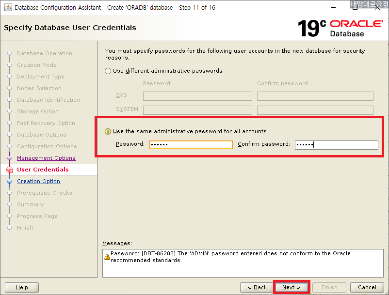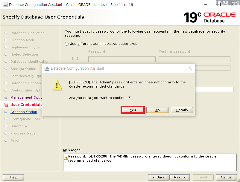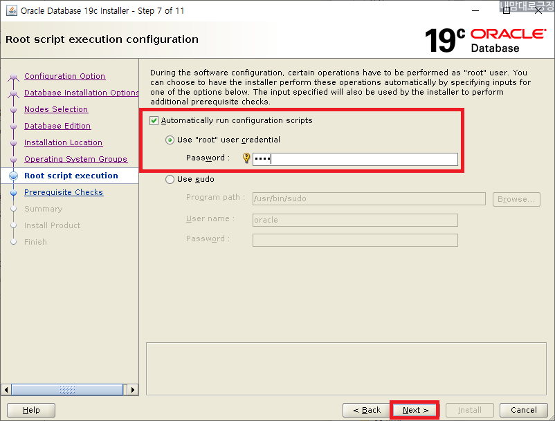 설치 중 root 권한으로 스크립트 실행하는 부분에서 자동로 스크립트 실행할지 여부 지정 root 패스워드 입력