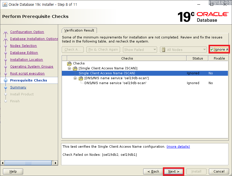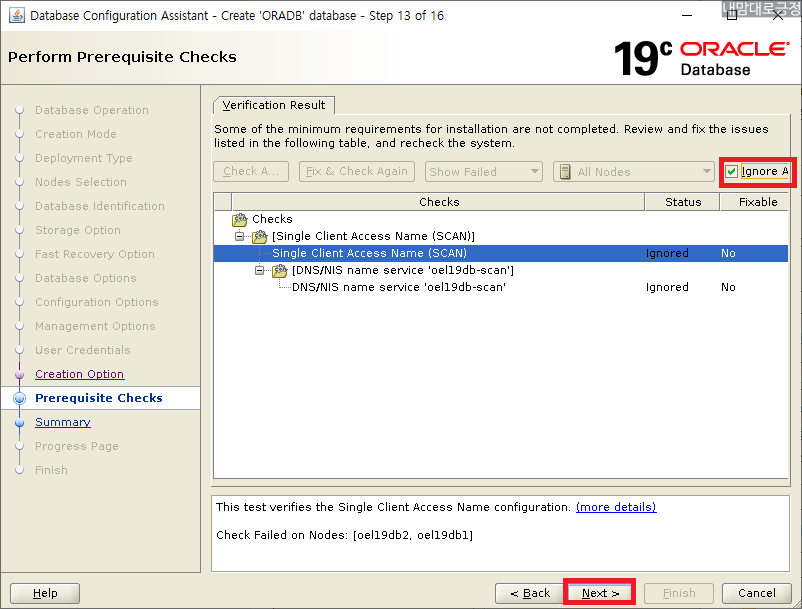 SCAN 관련메세지는 SCAN IP가 DNS에 등록되어 있지 않아서 발생한 문제 모두 Ignore