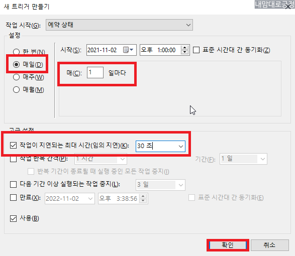 매일 1일마다, 작업지연시간 선택