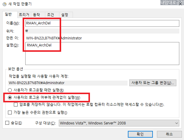 작업 이름, 설명 작성 후 보안옵션 선택